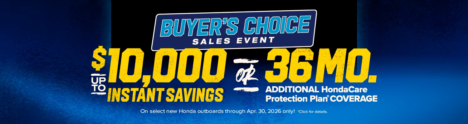 *At participating Honda Marine dealers only. Qualified retail customers may receive savings off the selling price of a Honda powered boat package or Honda Marine engine(s) sold for repower. This promotion is limited to new Honda Marine BF40–BF350 outboard engines, 2021 and newer models, in stock, sold and delivered between January 5, 2026, and April 30, 2026, delivered to a US resident. May be combined with certain other promotions. Only Honda Marine outboard engines sold for personal use qualify for this promotion. Fleet, rental, commercial, and government sales, demo engines, and engines sold under special pricing/promotions including (but not limited to) guides, brand ambassadors, and tournament fishermen are ineligible. Dealers set their own pricing. Actual contract coverages, limitations, and exclusions may vary. HondaCare Protection Plan® not available in South Carolina. 36-month HondaCare Protection Plan® does not apply to the M300 model. Honda Marine reserves the right to modify, amend, cancel or revoke, in whole or in part, this promotion at any time without prior notice. All Honda outboards meet EPA and CARB emission levels. Always wear a personal flotation device while boating and read your owner’s manual.
